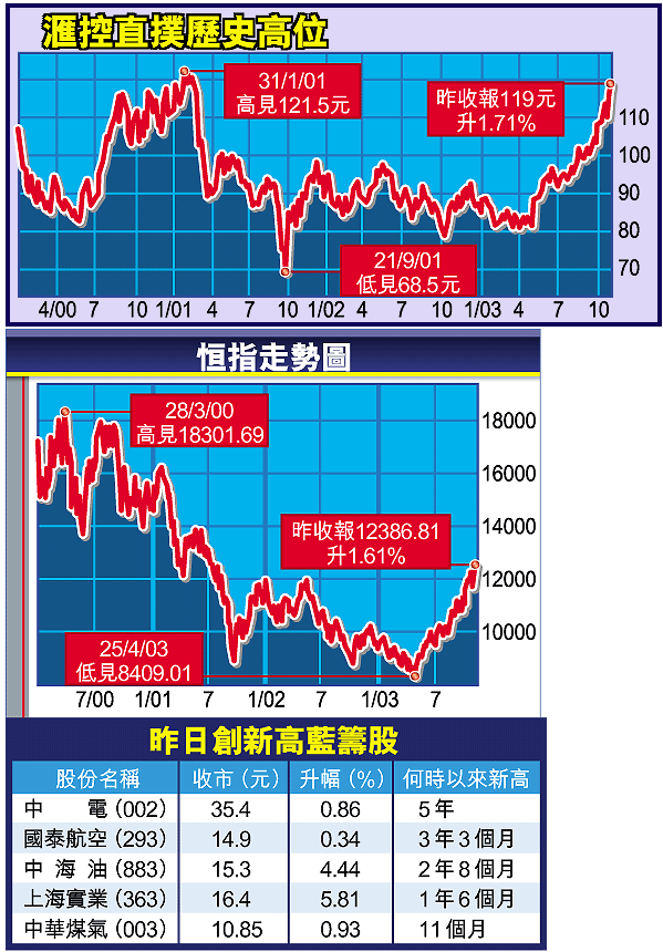 另外,李錦表示,較早時接觸過的部份基金經理,他們對港股仍然「瘋狂」,相信大市仍有上升空間,多隻股份昨日創逾1年新高(見表)。他指出,投資者已從吸納地產、出口及電訊股,換馬到銀行及國企股,由於恒指已貼近50個月平均線12420點,故預期,在資金充裕的情況下,大市可望突破這阻力位。
