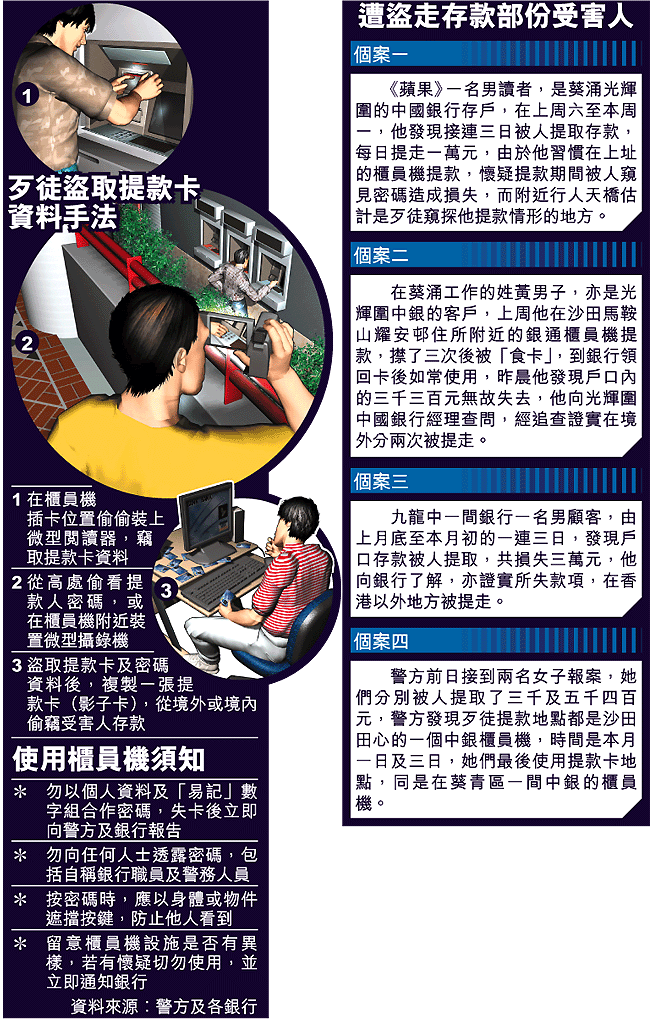 市民的存款無故被提走,懷疑歹徒在自動櫃員機內做手腳,可能裝置微型解讀機,取得提款卡資料,並在附近裝設針孔攝錄機,或在背後窺竊密碼,將盜取的資料複製假卡後,盜取受害人的銀行存款。警察公共關係科指出,涉及提款卡及信用卡資料被盜用案件,大多數是受害人的錢包失竊,或將密碼放在銀包內,以致造成雙重損失。關於有不法分子用微型攝錄機偷拍,竊取提款卡密碼,卻未能夠證實。