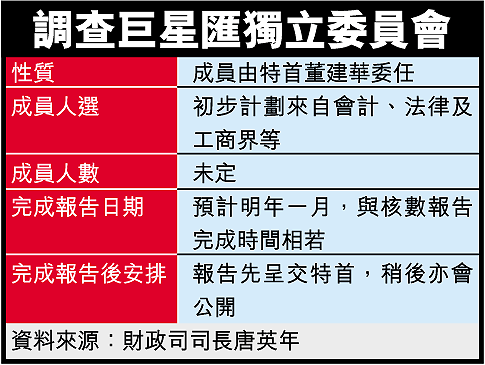 【本報訊】財政司司長唐英年昨突然宣布,特首將委任一個獨立調查委員會,調查巨星匯的收支安排,以圖擺平市民對巨星匯的質疑;然而,委員會成員及職權範圍卻仍未確定,反映決策極匆忙。唐英年昨拒絕回答港府用一億元為巨星匯包底是否物有所值,只說調查報告可向市民交代之餘,也可「還相關人士一個公道」。 記者:譚暉、羅偉光
