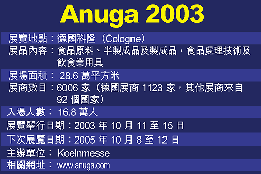 每兩年舉行一次的Anuga食品展,主要展出環球飲食出口產品。雖然今年的展商數目比上一次展覽減少了200家,共得6006家,但入場參觀人數比上一次反而增加4萬人至16.8萬人,可見展覽的叫座力。