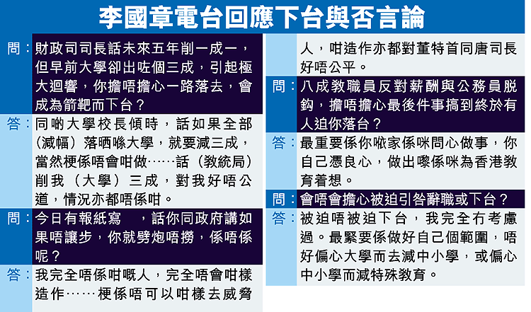 據了解,李國章最近曾向政府高層表明,若財政司司長唐英年堅持其削減教育開支幅度,他一定辦不到,只有選擇辭職。他昨稱,不會以辭職要脅政府不削減教育撥款。
