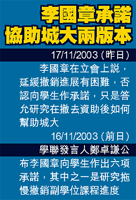 而繼大專學生後,高等院校教職員會聯會十多名代表昨與教育統籌局局長李國章面晤。該會提出,財政司司長唐英年要求各部門在未來五年要削減開支百分之十一,而大學在○四?○五年已確定要被削資百分之十,所以他們只接受在○五至○八年再削資百分之一,而非李國長早前與大學談及的最多三成。
