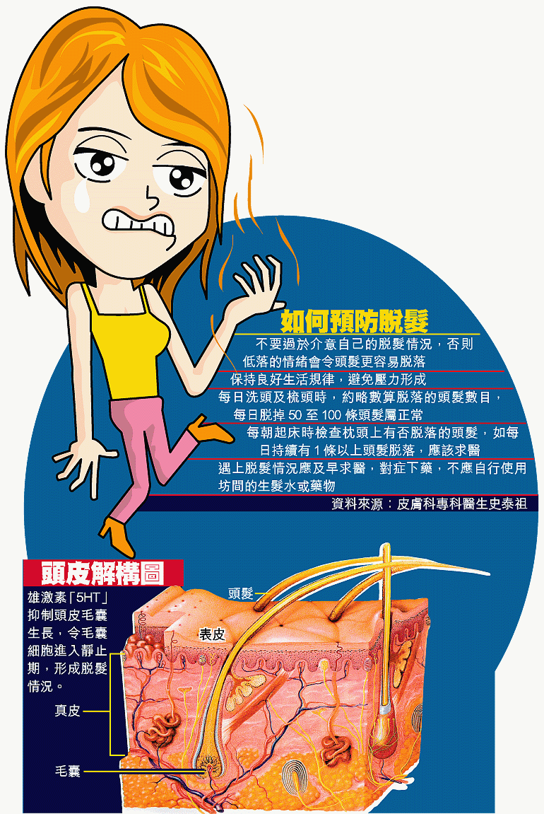 【本報訊】脫髮不只是「男人最痛」,同時也困擾不少女性,頭上的煩惱絲逐條逐條脫落,所增添的煩惱卻愈來愈多。有皮膚科醫生表示,不論男女均有可能出現「男性脫髮」問題,情況更有年輕化趨勢,不少二、三十歲的男女已出現脫髮現象。專家強調脫髮現象與壓力有關,呼籲要樂觀面對脫髮事實,否則只會令脫髮情況惡化下去。 記者:陳倩雯