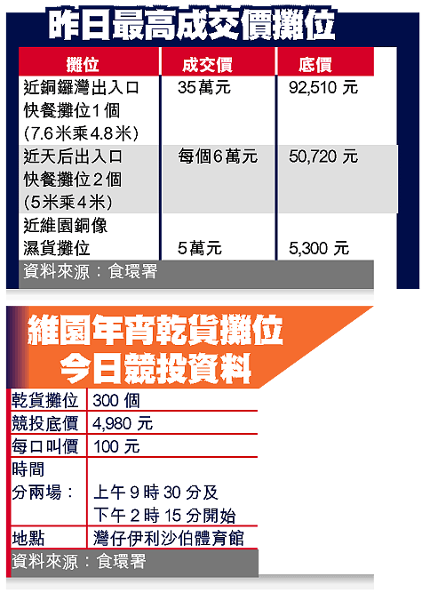 食環署表示,昨日推出的一百八十個濕貨攤位及三個快餐攤位全部租出。今年濕貨攤位總成交價達三百四十二萬多元,較去年增加四十多萬;三個快餐攤位成交價合共為四十七萬元,較去年下跌近三成。