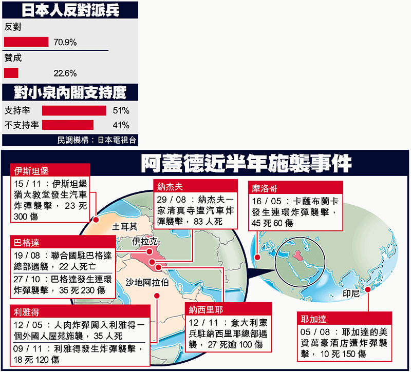 駐伊意軍上周遇襲,是「意大利的九一一」,意軍遭遇了二戰以來的最大死傷。隨着意軍遇襲,本來決意在今年底派兵到伊拉克的小泉純一郎政府立即打退堂鼓,對派兵時間遲疑不決。阿蓋德對日本的點名警告,勢令自衞隊前赴伊拉克的事件再添變數。