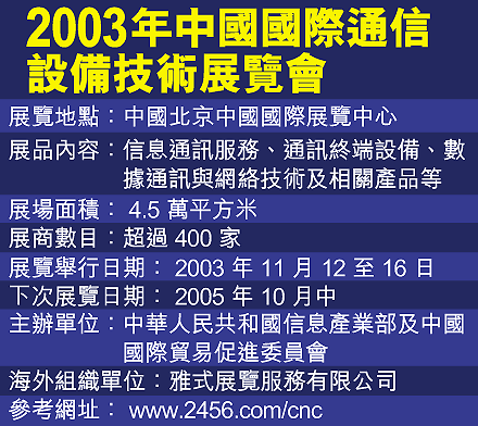為期5天的「中國國際通信設備技術展覽會」,於北京的中國國際展覽中心舉行,展場面積達4.5萬平方米,展商來自21個國家及地區,其中包括多家著名企業,例如上海貝爾阿爾卡特、思科系統、大唐電信、愛立信、LG電子、西門子及東芝等。