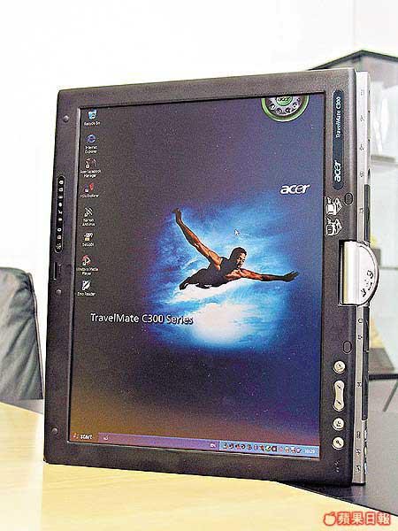 最大屏幕TabletPC BillGates剛喺COMDEX2003嘅演講中力推TabletPC,咁啱acer同期都有部TravelMateC300推出,而且係第一部使用14.1?特大屏幕嘅TabletPC,有更大「書寫」空間,而且更特別加入智能感光器,可以自動調整光暗,配合Centrino1.4GHz規格,進一步替用家慳電,最長可用足7個鐘。另外,亦備有MMC、SM、SD及MS4合1讀卡器,影完相就可以即刻睇番。 acerHK 查詢電話:25280233