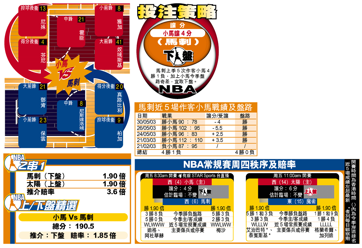 再看馬刺及小馬去季交手戰績及盤路,馬刺上季八次對小馬勝五仗,尤其作客表現更為突出,連同季後賽五次造訪小馬竟勝四次,平均更淨勝八點五分;而在當中有開的四個盤口(見附表),馬刺更獲全勝,由此可見主場的小馬實在讓不起馬刺。巧合的是,這兩支西岸宿敵近七次交手中,得主場之利一方的球隊最終都沒有好收場。