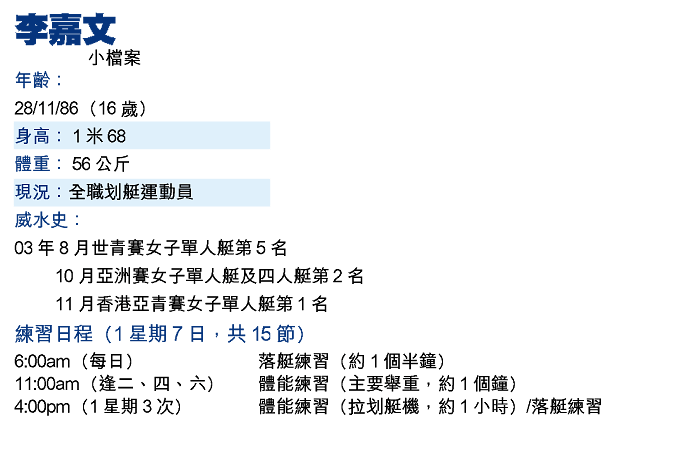 若成事,嘉文又多一個「第一」,就是年紀最細的香港女子划艇手參加奧運會。只是今次真的有難度,由於奧運不設輕量級單人艇,嘉文必須「越級」挑戰重量級單人艇組,最終結果會在明年四月的上海亞洲區奧運選拔賽中揭盅。