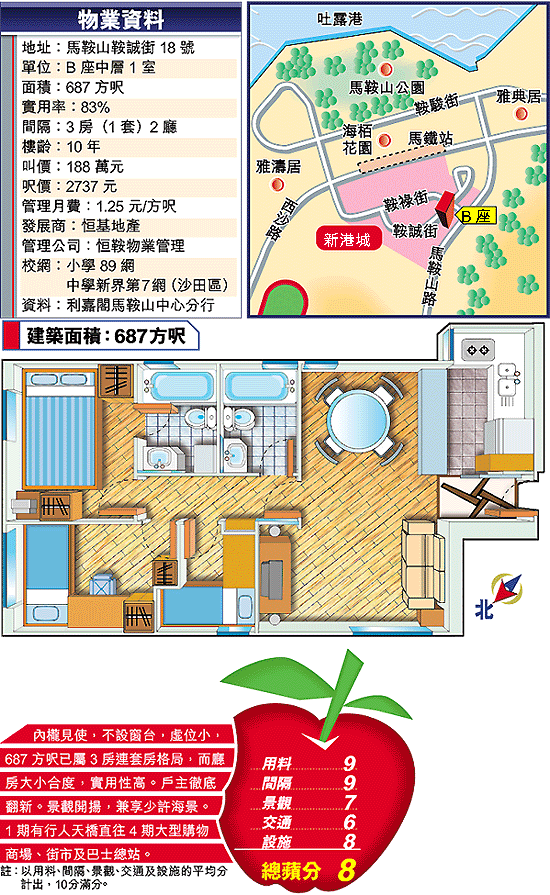 馬鞍山新港城1及2期樓齡已達10年,外觀質素難與新建物業相比,但單位實用度高,600餘方呎單位已屬3房連套房間隔,廳房大小合理,較同類面積的新樓單位更具空間感。是次介紹的單位屬1期B座,687方呎,戶主花費近30萬元,將全屋大翻新,並改動部份間隔,強化單位實用性。