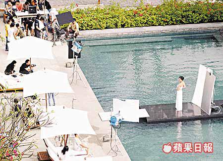 今次廣告商取景的涵碧樓,由於糅合了中西的特色,故許多廣告都選在這裏拍攝。為期三天的拍攝,除了在涵碧樓內取景外,也選擇露天泳池畔作背景。前天下午,嘉玲穿上一襲白色的泳裝現身泳池旁邊,嘉玲的出現更吸引了許多服務生到來湊熱鬧,雖然嘉玲已年屆三十七,但仍然保持着驕人的身材,當她卸下身上的大浴巾,露出性感泳裝的一刻,在場圍觀的人群即報以一陣驚呼。