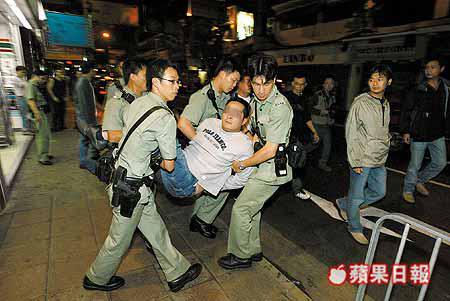 大批警員趕至控制場面,將一名姓張(二十七歲)涉嫌非禮男子拘捕時,另一名姓林(三十四歲)男子涉嫌阻差辦公阻止警員拉人,雙方糾纏兩名警員受輕傷,在場多名男子大叫:「差人打人!」及粗言穢語辱罵警員,情況混亂。