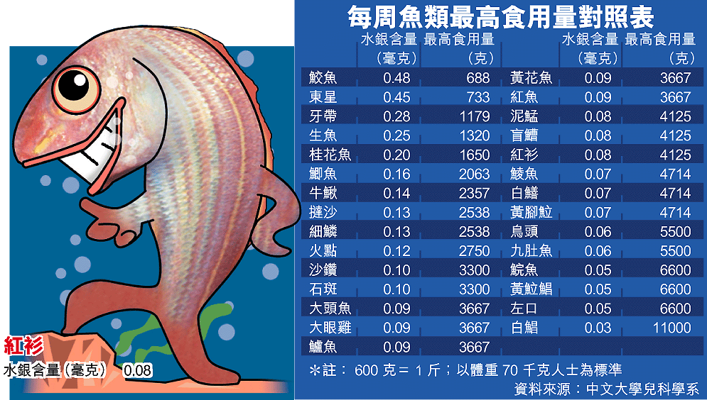 中文大學內科及藥物治療學系教授陳恩強則舉例說,以水銀含量較高的東星斑為例,一個體重七十千克的人,每星期食用逾一公斤才會超出世衞標準;至於其他水銀含量低的魚類,食用數公斤才會有問題,所以市民無需要改變食魚習慣,只有孕婦及一至三歲的兒童需要稍加留意。