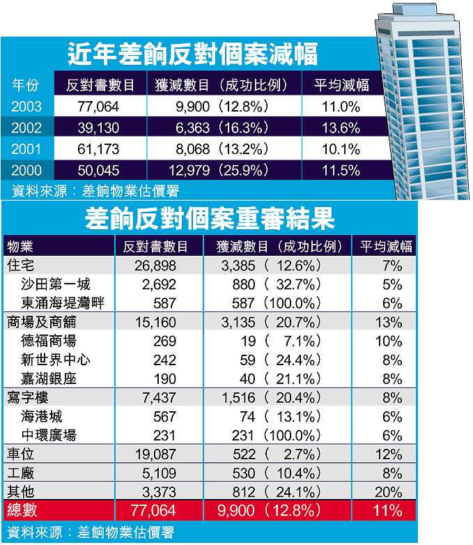 差估署昨日公布重審結果,七萬七千多宗反對個案中,有九千九百宗反對成功,獲得減差餉,平均減百分之十一。其中住宅物業共有二萬六千八百多宗反對,有三千三百多宗成功獲減差餉,佔百分之十二點六,平均減幅為百分之七。最多反對書的是沙田第一城,約有二千七百宗反對,其中八百八十宗成功獲減平均百分之五;東涌海堤灣畔有五百八十七宗反對,成功率達百分百,全部獲減平均百分之六。沙士疫症影響嚴重的淘大花園有六百七十宗反對,德福花園有二十三宗反對,但全部反對均失敗。