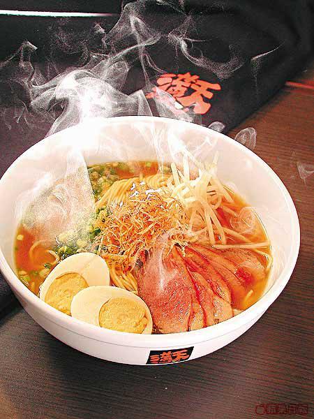總店在大阪的滿天拉麵,其招牌湯麵,麵不算太幼,但湯色十分清,更加入法國元素,依炮製醬油叉燒的方法,照辦煮法國鴨胸,把鴨胸肉烚至將近熟,這樣切片時就會呈現至誘人的粉紅色,問廚師西