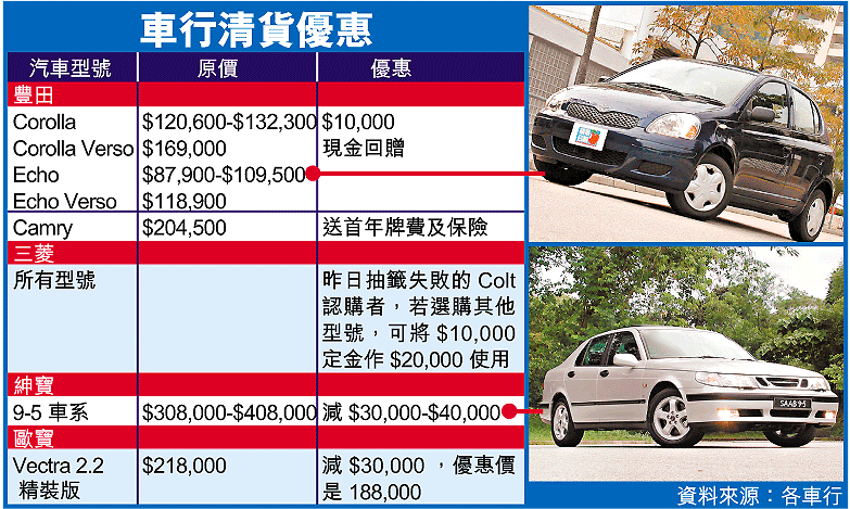 【本報訊】車行年尾減價清貨的行動持續,銷量最高的豐田Corolla及Echo都提供一萬元現金回贈、紳寶9-5減三至四萬元、歐寶Vectra減三萬,汽車業人士表示,由於日圓及歐羅滙價持續高企,當車行的舊貨售清後,新一批汽車將會全面加價一成半。