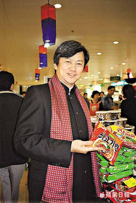 紅磡漁人碼頭商場辦韓國節,身為主人家嘅長實趙國雄,噚日出席開幕儀式嘅同時,重買番啲韓國食品「應節」。現場有唔同嘅韓國產品攤檔,有食品同電器等,老趙就對即食麵情有獨鍾,一共掃咗40包共4款口味,重推介黃色包裝嘅即食麵畀記者,另外又買泡菜同蘿蔔,埋單500幾蚊。