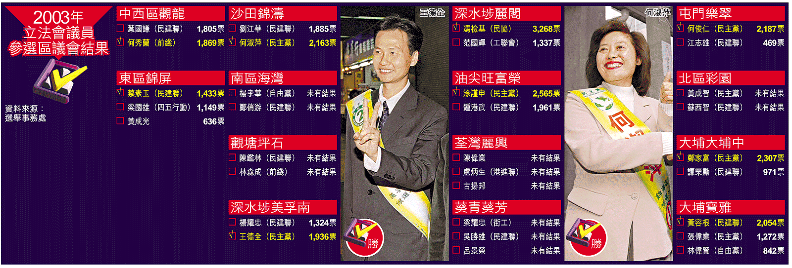 獲多名反23條大律師支持的何秀蘭,形容今次是居民的勝利,她希望選民於明年立法會選舉再接再厲行使投票權,要求港府分別於○七年及○八年普選特首及立法會。葉國謙說完全尊重市民決定,相信7.1的確對選票有影響,葉在公布結果前已表明,雖然他是循區議會功能組織進入立法會,但即使落敗也不會辭去立法會議席。