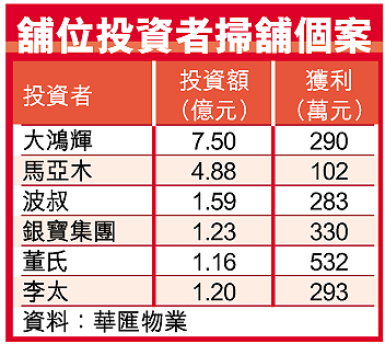 除新晉舖位投資者外,資深投資者也再度積極掃貨,購入舖位總值逾1億元的超過10名,當中以大鴻輝集團最進取,今年至今購入45項舖位,僅有8項在購入不足半年沽出。