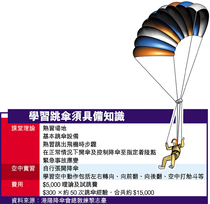 他說,跳傘較學習駕駛小型飛機廉宜,每跳三百元,一般累積了約五十多跳的經驗即可合格,但具體要視乎學員的資質而定;另要加一筆約五千元的理論及試跳費用。本港喜愛跳傘的市民來自不同界別,目前該會活躍的跳傘會員有司機、護士、工程師、電工、醫生、車房以至建築工人;朱幼麟笑說,跳傘是一種很特別的活動,「一係就俾佢嚇親,一係就一跳上癮。」