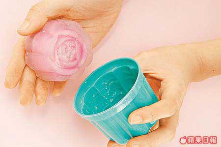 2.待第一層完全凝固後,再煮溶皂基,調上綠色作花花池水的第二層。綠色皂液不能太熱,否則倒模後會熱熔第一層已凝固的香皂。但若待太久,則本身會凝固了而注不了模,同樣注入模具的1/3份量。