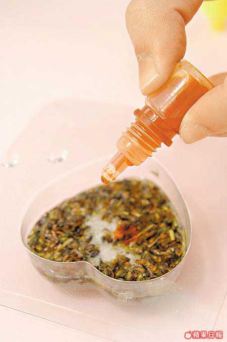 *上述14-15滴的香薰油份量,適合調於香梘重約30克的模具上,若所選用的模具Size有所出入,可酌量按比例加減精油份量。