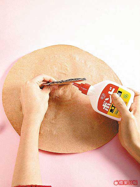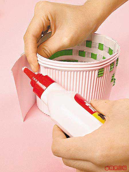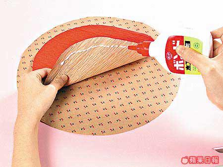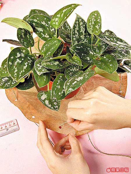 我參考日本雜誌,利用花紙如包禮物般將花盆包裝好,還替它打了一個蝴蝶結,效果煞是好看。我用了兩張不同款式的花紙,增加其厚度之餘,亦豐富了色彩。然後在花紙上再塗一層光油,除令紙盆更挺身外,還有令立立的效果,驟眼看還以為是陶瓷真花盆。