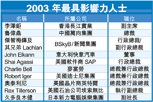 【本報訊】美國有線新聞網絡(CNN)及《時代雜誌》昨公布,聯手評估的03年全球最具影響力人士榜,在排名不分先後下列出20人名單,其中香港上榜的只有長實(001)副主席李澤鉅;另一華人為中國第四大富豪魯冠球之子、萬向集團總裁魯偉鼎。