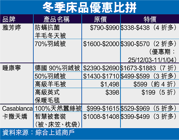 天氣漸冷,多間床品公司為爭奪市場,紛紛以優惠價搶客,最低只售兩折多。當中不少產品都具有防蟎抗菌功能。雅芳婷廣告部高級經理鍾綺雯表示,近年不少巿民喜歡上深圳購買廉價棉被,但由於內地棉被質素參差,加上沙士疫潮令巿民意識到家居衞生的重要,所以今年多了巿民在港購買較優質的棉被。