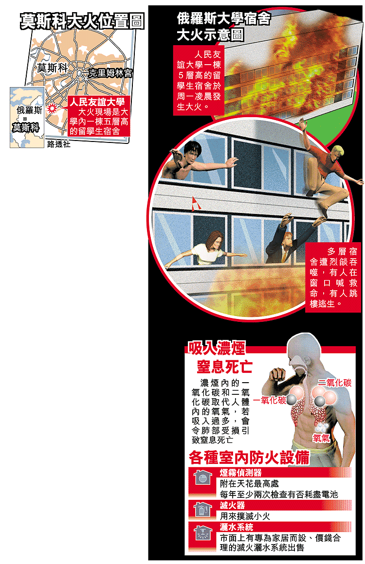 俄羅斯首都莫斯科周一凌晨,天黑漆漆,位於莫斯科西南部的人民友誼大學一棟五層高的學生宿舍,許多留學生都進入夢鄉了。但宿舍突然大火,宿舍多層被烈燄濃煙和火舌吞噬,烈燄燒來,至少三十二名留學生給活活燒死,另有一百三十九人受傷,包括跳樓逃生摔斷手腳的中國學生;中國駐俄使館消息指共有四十多名中國留學生受傷,十三人下落不明。這是莫斯科十年來死傷最慘重的大火,當局不排除有人縱火肇禍。