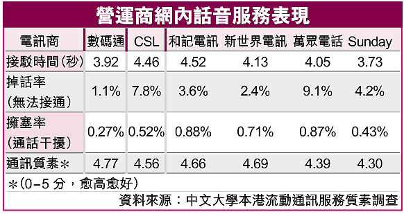 據他們經驗,流動數據有如「食快餐」,服務應預先包裝好,再按個人喜好增減內容;收費亦應簡單易明,最終能令消費者獲益。雖然各營運商推出的服務大同小異,但他認為不應着眼於鬥低收費,反而服務質素才最重要,這樣才能令顧客繼續使用流動數據服務。由於要為數據業務投入資源,他說,本港流動通訊質素亦如歐洲營運商一樣,有下降趨勢(見表)。