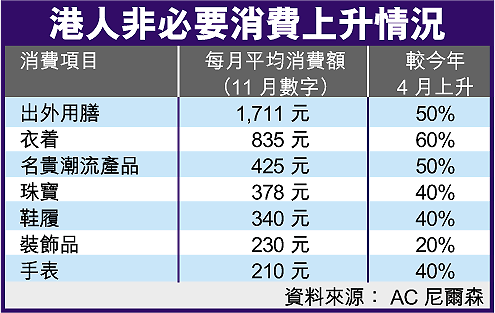 當中尤以香港人為消費意欲最強的一群,八成六表示會增加非必需品消費,而港人過去六個月在各類非必需產品上的消費金額則大幅增加二至六成。