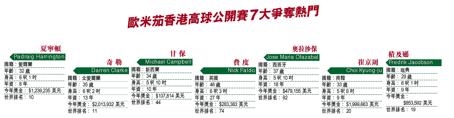 七位高爾夫球壇巨星:愛爾蘭的夏寧頓、英國的費度、新西蘭的甘保、北愛爾蘭的奇勒、西班牙的奧拉沙保、南韓的崔京周及瑞典的積及遜,均已落實來港角逐於下月四至七日舉行的歐米茄香港高爾夫球公開賽,陣容之強冠絕歷屆賽事!
