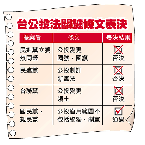 不過,民進黨提出的「防禦性公投」主張(即台灣若在受外力威脅,令主權有變更危險時,總統經行政院會決議後,可將國安事項交付公投),在國、親兩黨開放投票下,獲得通過。此外,立院昨日也同意公民投票可在總統大選同一天舉行。