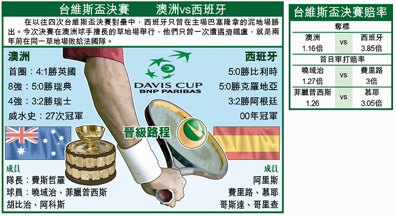 【綜合澳洲外電】今屆台維斯盃決賽將於周五在澳洲舉行,由澳洲與西班牙爭標,而經過周四的抽籤後,首場單打即爆發大戰,由澳洲的前世界第一曉域治與世界排名第三的費里路較量。