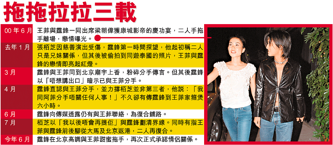 現年三十四歲的王菲與二十三歲的謝霆鋒,拍拖以來一直又離又合,不被睇好,即使期間張栢芝曾介入,但阿菲都重投霆鋒懷抱,誰知二人終究難逃分手的命運。據本報收到消息,霆鋒早前向友人透露已與阿菲分手,適逢阿菲出新碟及演唱會舉行在即,難免令人聯想到二人聯合谷宣傳,但以阿菲性格,她從不愛借緋聞宣傳。