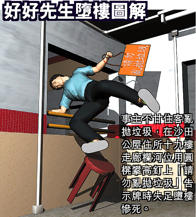 【本報訊】「沙士」過後,環境衞生已成為全港市民的共同責任,但是沙田博康邨有部份居民,仍然將走廊及電梯大堂當作「垃圾收集站」,面對蚊蟲滋生及惡臭難忍,一名被街坊稱為「好好先生」的茶餐廳侍應,向有關方面屢次投訴無效後,昨午在十九樓住所走廊,欲將一個「請勿亂拋垃圾」的告示牌釘在牆上時,失足從欄河上飛墮而下慘死。 記者:文兆麟