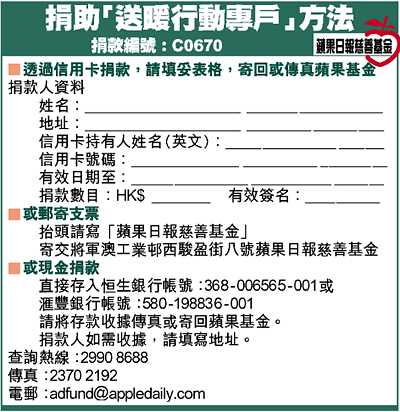 為了幫助社會上的弱勢社群度過嚴寒,蘋果日報慈善基金月前展開「送暖行動」,募集社區人士捐款,資助非牟利社會服務機構購買禦寒物資,迄今接獲十多間機構申請合共三千四百多件禦寒衣物,包括棉被、毛氈、棉褸、頸巾和冷帽等,惟要讓更多貧窮家庭受惠,有賴善長踴躍捐款,支持蘋果基金「送暖行動」。
