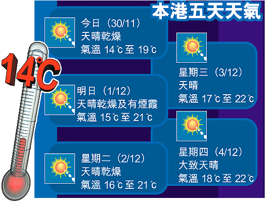 一股東北季候風為華南沿岸地區帶來清涼及乾燥的天氣。本港今日天氣預測為天晴乾燥,相當清涼,市區最低氣溫約攝氏十四度,新界再低兩三度,最高氣溫約十九度。今日吹和緩北至東北風,離岸海域風勢間中清勁,展望未來數天持續天晴乾燥,早晚天氣頗為清涼。