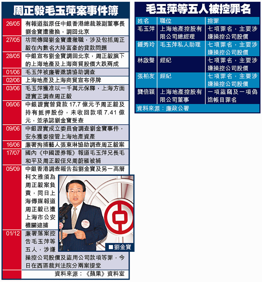 這宗轟動中港的內地民營企業在本港涉及最嚴重的懷疑貪污金融詐騙案,源於「上海首富」周正毅牽涉中銀香港前總裁劉金寶主掌中銀香港期間,批出數以億元計的問題貸款予周正毅任主席的上海地產,周於今年中在上海被扣查。