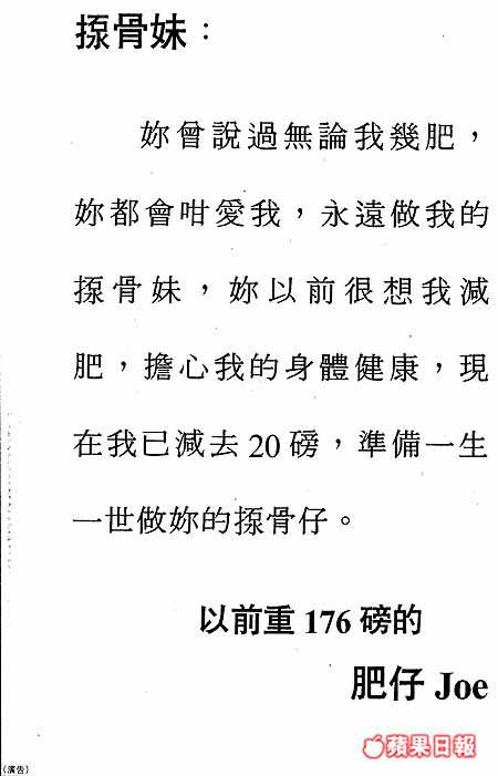 王: 呢啲廣告曾經喺我哋分開咗嘅階段,劉生喺報紙上刊登畀我睇。(語帶哽咽)無論流過幾多淚,甚至乎犧牲咗幾多、付出咗幾多,只係我、佢,同埋我哋啲屋企人先至知道。其實我同劉生之間嘅感情,帶畀我同我屋企人好多痛苦,當然亦有開心嘅時間,但作為佢身邊嘅女朋友,我忍受咗好多嘢,當然唔係淨係痛楚啦,佢都好清楚知道,所以到最後我係接受唔到繼續咁生活落去,而導致大家要分開。到最後嘅階段,我承認係我提出要分開嘅,對我嚟講都係一個好痛苦嘅選擇。喺最後階段,我承認劉生好有誠意,好多次向我認錯,甚至乎希望挽留呢一段感情。但到最後都係接受唔到,因為我唔想我或者我屋企人繼續唔開心。
