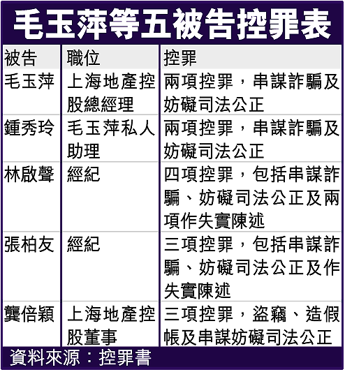 現年四十一歲的毛玉萍、其私人助理鍾秀玲(三十歲)、兩名經紀林啟聲(四十一歲)及張柏友(四十四歲),同被控一項串謀詐騙罪,指他們於去年六月至今年五月,在港聯同周正毅及另兩人,製造虛假及誤導性現象,令上地股票看似交投活躍,藉以詐騙其他人買賣。