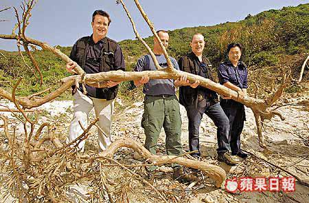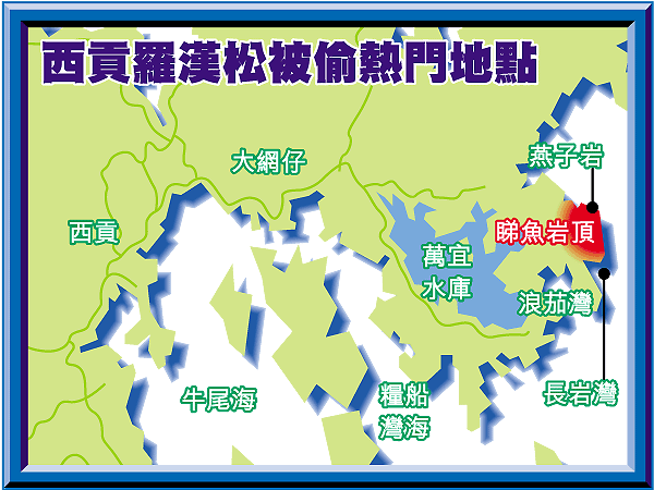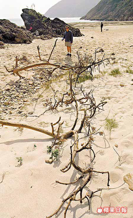 海灘上有十多棵早前偷松賊未及搬走的羅漢松,有大有細,大的有十幾呎,細的也有四、五呎長,但已漸乾枯;韋湛聲指着遠方的山頭,由偷松賊開闢出來的山路縱橫交錯,越過另一邊山是燕子岩,連旅行人士都不會闖至,但生長很多羅漢松。