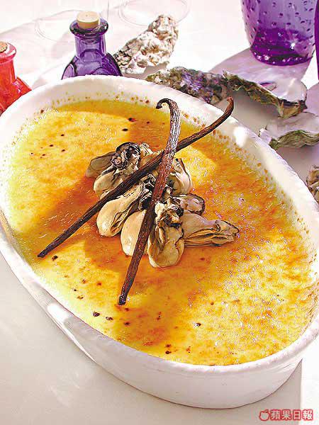 法式鮮蠔燉蛋:以傳統法式燉蛋的方法炮製,但用上價錢較貴的呍呢拿枝,令呍呢拿香味更濃。將鮮蠔飛水,再入檸檬汁、櫻桃酒、糖、檸檬皮和檸檬肉同熬至入味,使蠔變甜,配合燉蛋的味道。蠔連燉蛋入口仍然保持鮮嫩,但味道甜甜哋,加上蛋面的焦糖,味道創新。(c)