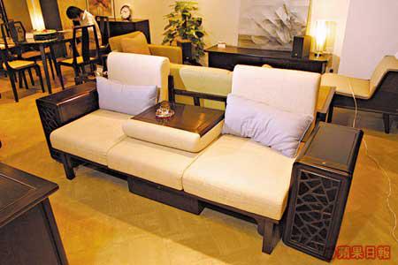 受不了酸枝長椅那種硬邦邦的感覺,這張木製布面梳化則是不錯的選擇。除座面柔軟,將中間的座墊向下反,即成為一張咖啡枱。若想坐得舒服,不妨加點錢改用牛皮布面。