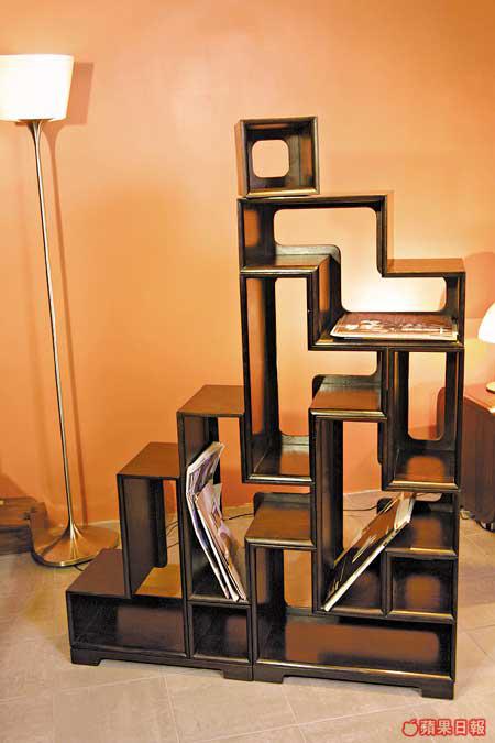 傳統百寶架儲物量豐富,惟體積龐大,是以設計師利用電子遊戲「俄羅斯方塊」的概念,製成不同形狀的獨立層架,方便用家如砌積木般,自行嵌出適用的模樣。
