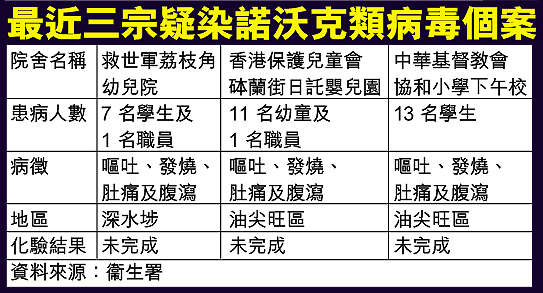 衞生署發言人表示,位於油尖旺的中華基督教會協和小學下午校,由有十三名學生於上月二十四至二十七日,陸續出現嘔吐、發燒、肚痛及腹瀉症狀,但至昨天大部份學生已康復,目前仍未確定是否諾沃克類病毒,仍有待化驗糞便樣本的結果。