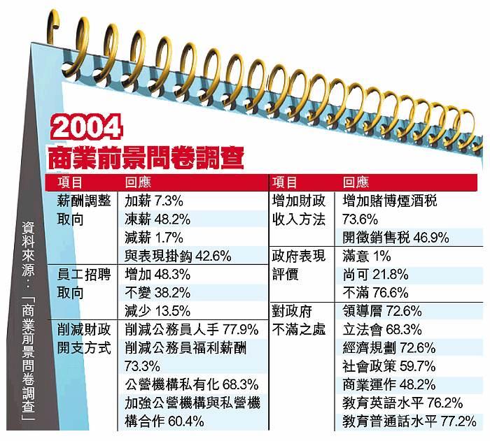 香港總商會於十月至十一月期間,進行每年一度的「商業前景問卷調查」,共訪問了三百家商會會員。調查評估了商界對財經前景的看法,但也反映出他們對政府不滿程度及不滿的地方。今次表達不滿的商界數量較去年上升,由百分之七十四點五升至七十六點七。他們主要的不滿地方包括:政府領導層、立法會、經濟規劃、教育政策上的英語和普通話水平、環境污染等事宜上。