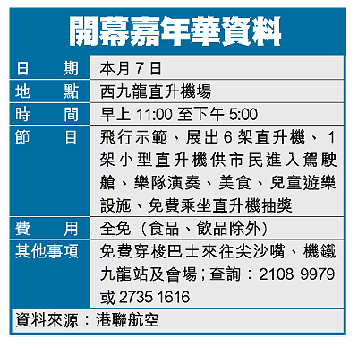 港聯航空商務總監劉紅英表示,本周日的直升機場開幕嘉年華,所有入場的市民都可參加抽獎,被抽中的六十名市民可獲安排即日免費的直升機維港遊,在維港上空飛行數分鐘。