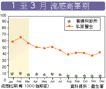 今年初沙士爆發,大家為預防沙士都勤洗手、戴口罩,患流感的人數創歷年新低,但根據過往資料顯示,每年首九個月都是感染流感的季節(左圖為2002年數字),而接受注射預防流感疫苗後,一般需要兩星期才能產生效用,而疫苗最佳保護期約六個月(若身體強壯健康,更可長達八至九個月),所以現在開始會是注射疫苗的最佳時候。一般私家醫生都會提供注射流感疫苗服務。